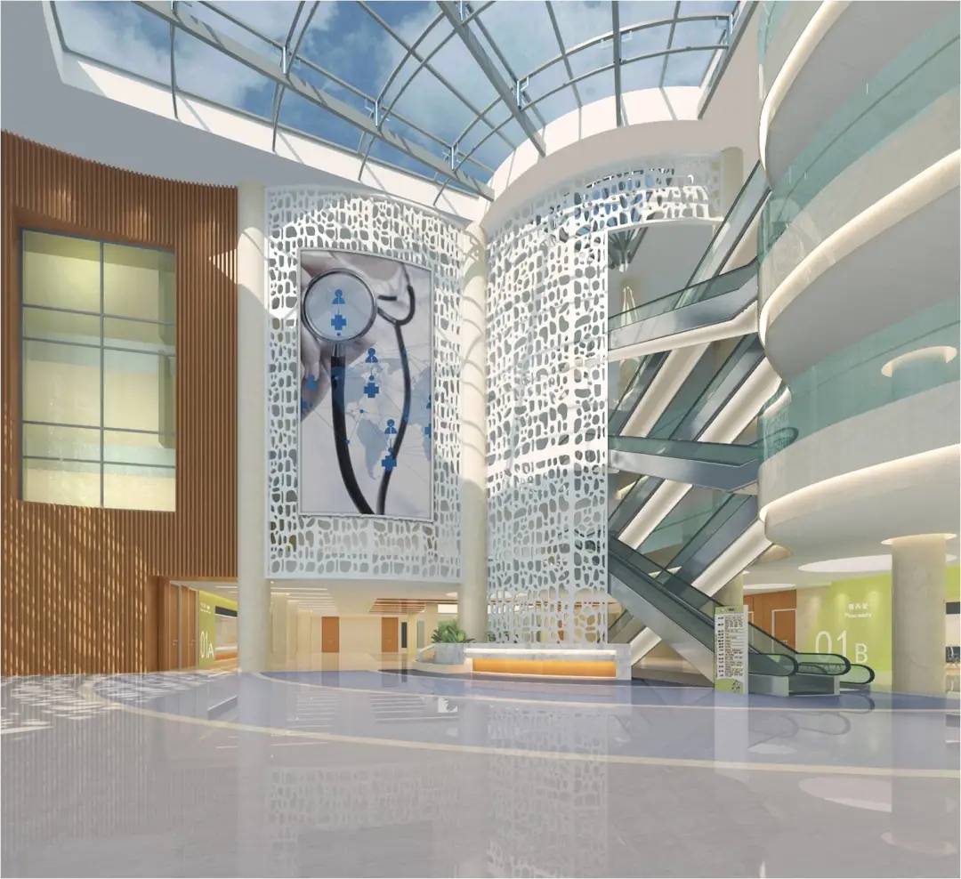 住院大廳天棚采用大面積玻璃采光頂,節約采光成本的同時營造廣闊的視覺空間。墻面采用仿石材瓷磚,與石材地面銜接,穿插氟碳烤漆鋼板柱子,通過對點線面的梳理,凸顯簡約、大氣、通透、現代化的視覺美感。