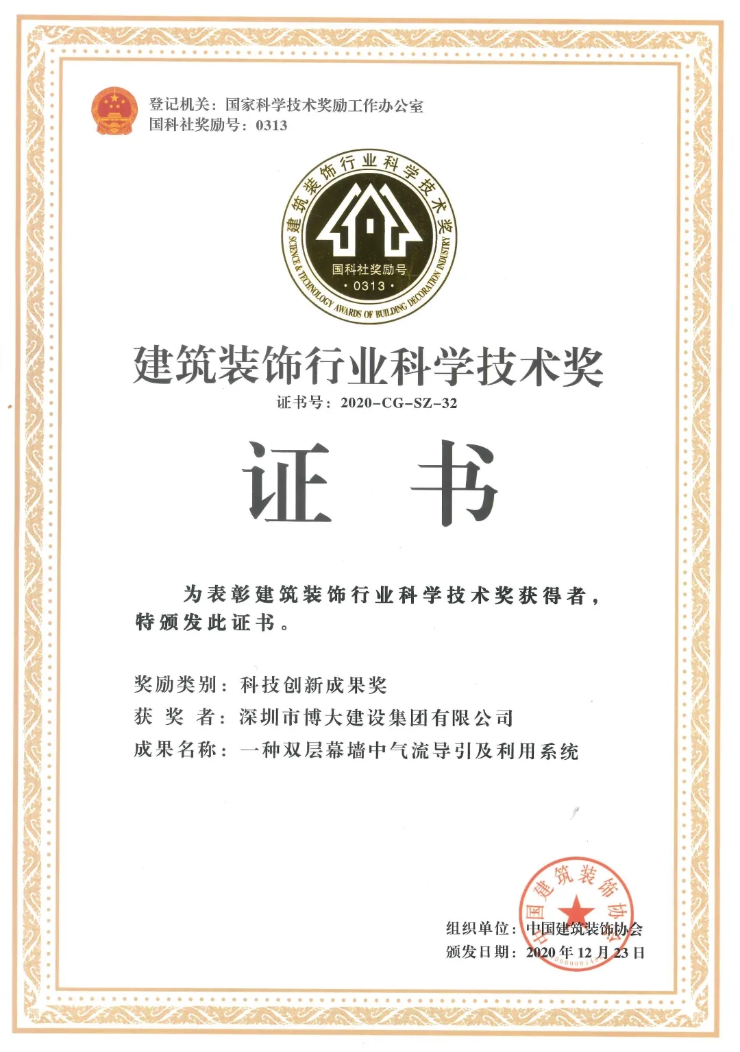 博大研發的一種雙層幕墻中氣流導引及利用系統創新技術榮獲二0二0年全國建筑行業科技創新成果獎。